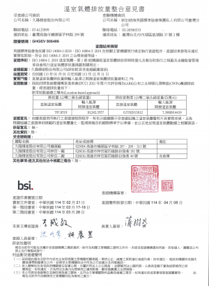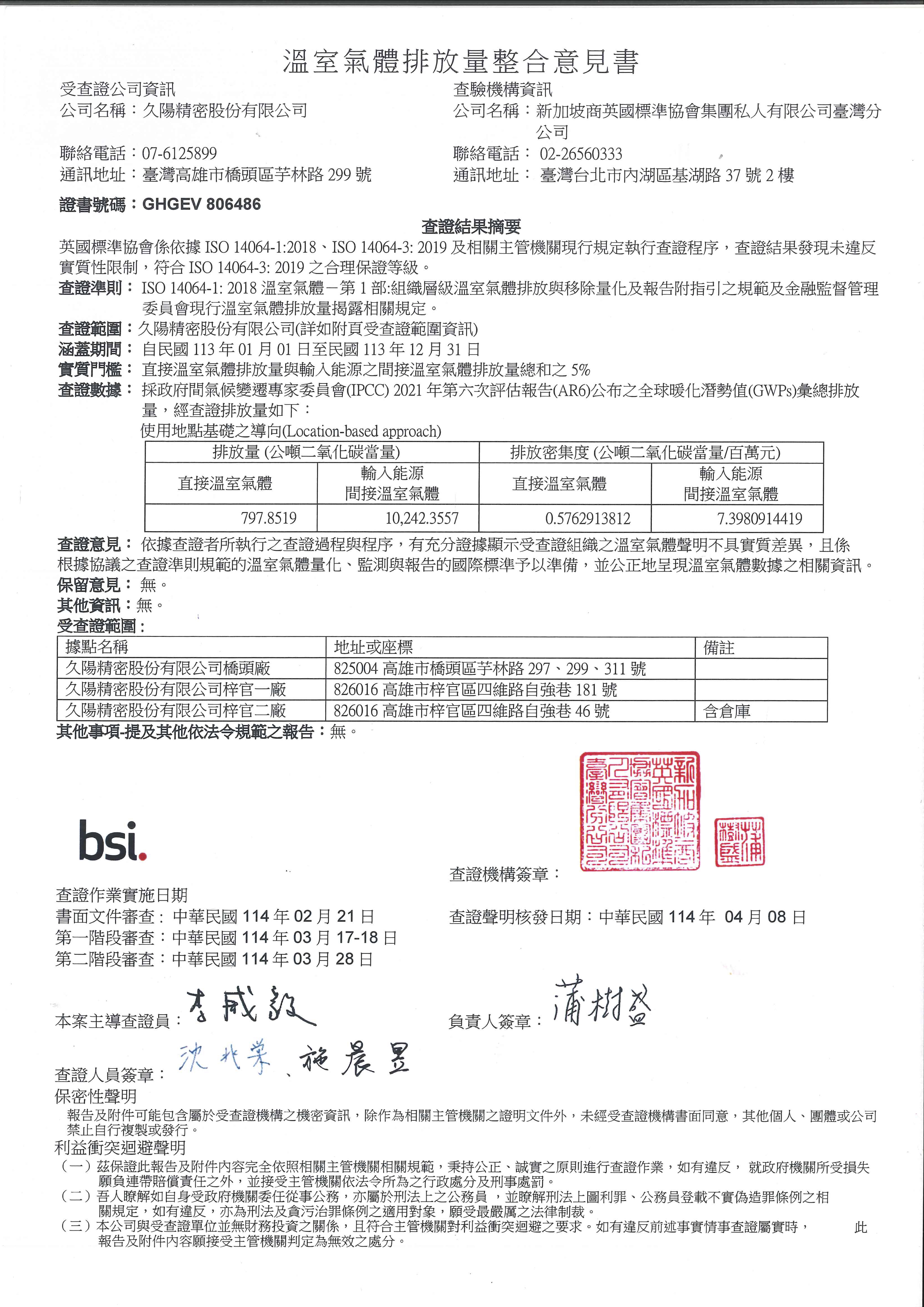 久陽精密通過ISO 9001、ISO 14001等專業工廠認證,更在生產、外銷獲得優質評等成績。本公司並配有各種專業實驗室與設備,能符合您絕大部分對於產品的需求。本公司初次於2013年取得ISO 14001驗證,於 2019 年 12 月再次取得 ISO 14001:2015的環境管理系統認證,依循集團環境管理方針: 「減緩地球暖化」、「保護自然資源」、「降低有害物質風險」為主軸,追求環境永續經營,並設定「管理 CO2 排放量」、「降低廢棄物量」、「綠色製造」為環境經營管理的短中期績效指標。ISO14001:2015最新證書效期自 2022/12/19至2025/12/18。